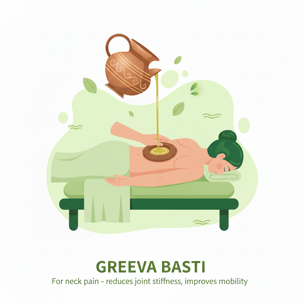 Warm medicated oil is held over the neck region to relax cervical muscles and ease tension.